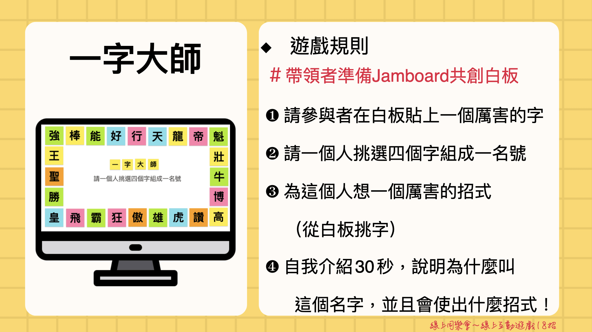 我精煉了多年來豐富的遊戲帶領經驗,設計出18款線上戶動遊戲內容,讓你從開學帶到學期末,讓你下載便能馬上運用!