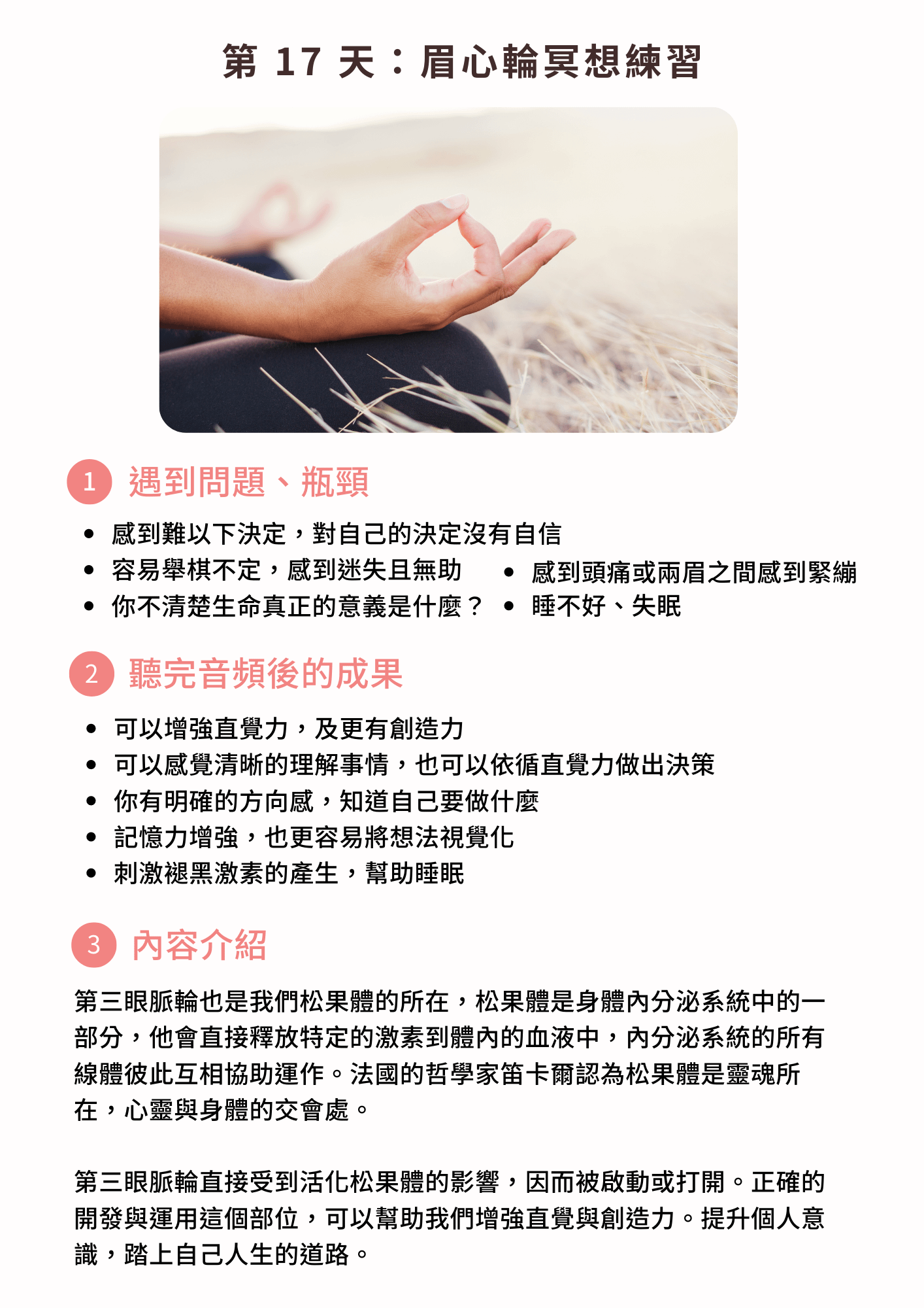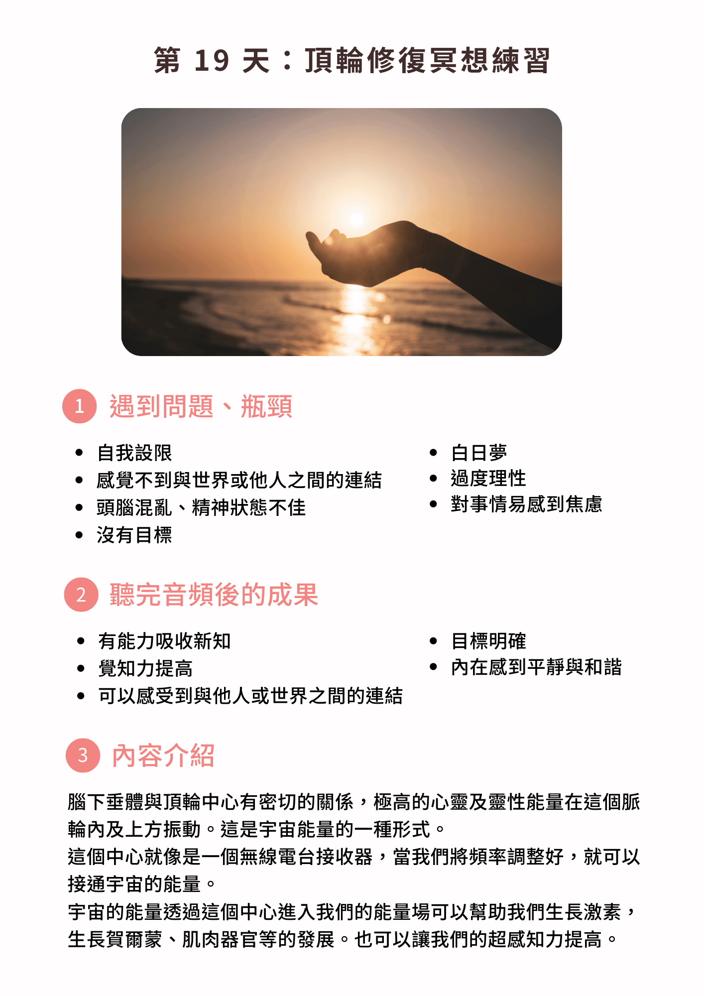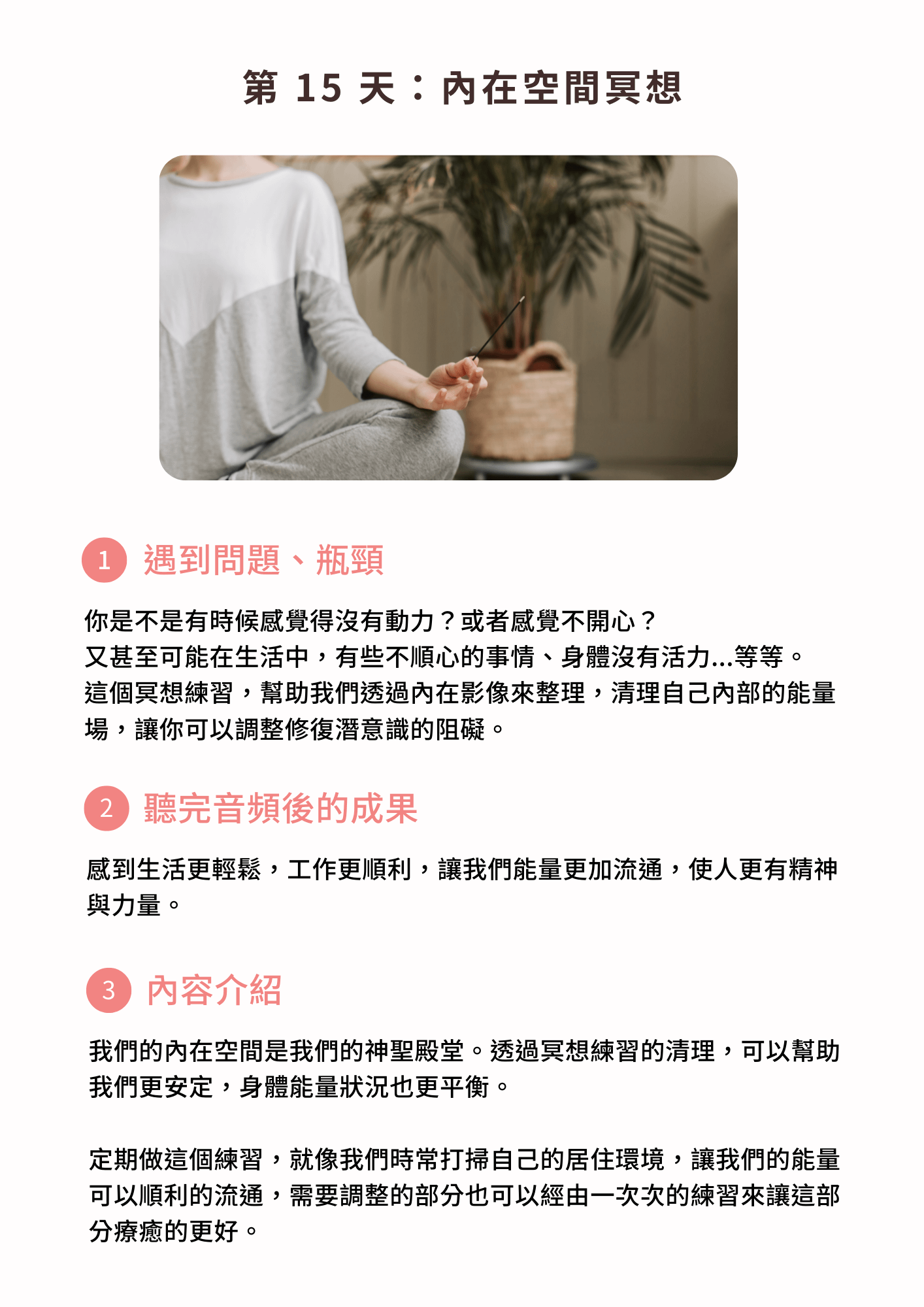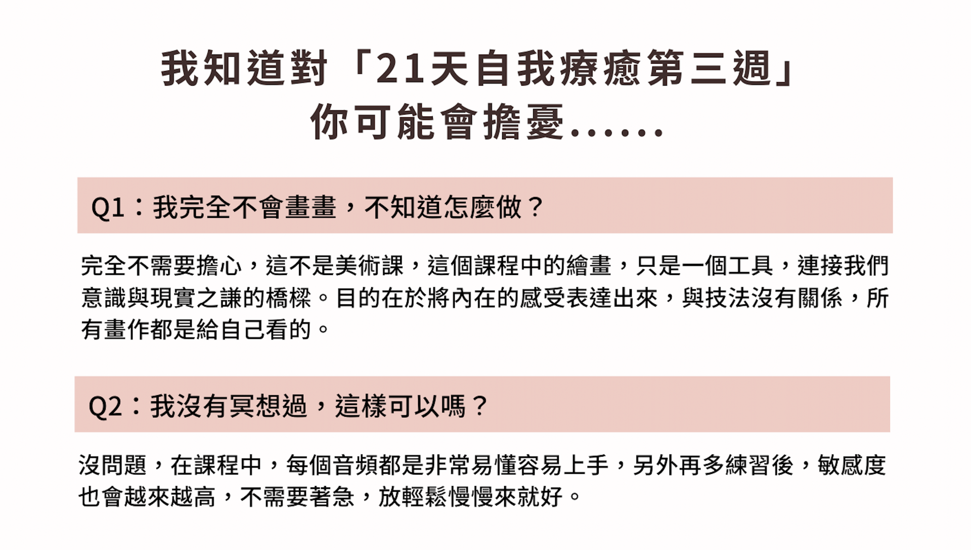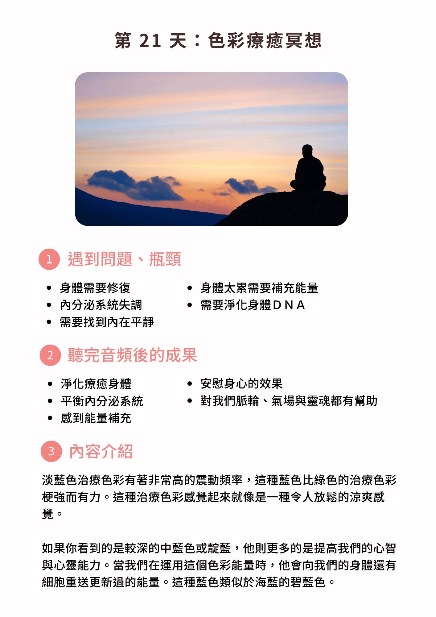 完整的療癒旅程是21天,當你經歷過第一二週,逐漸鍛鍊起自己的內在力量後,就能進入第三週的練習。