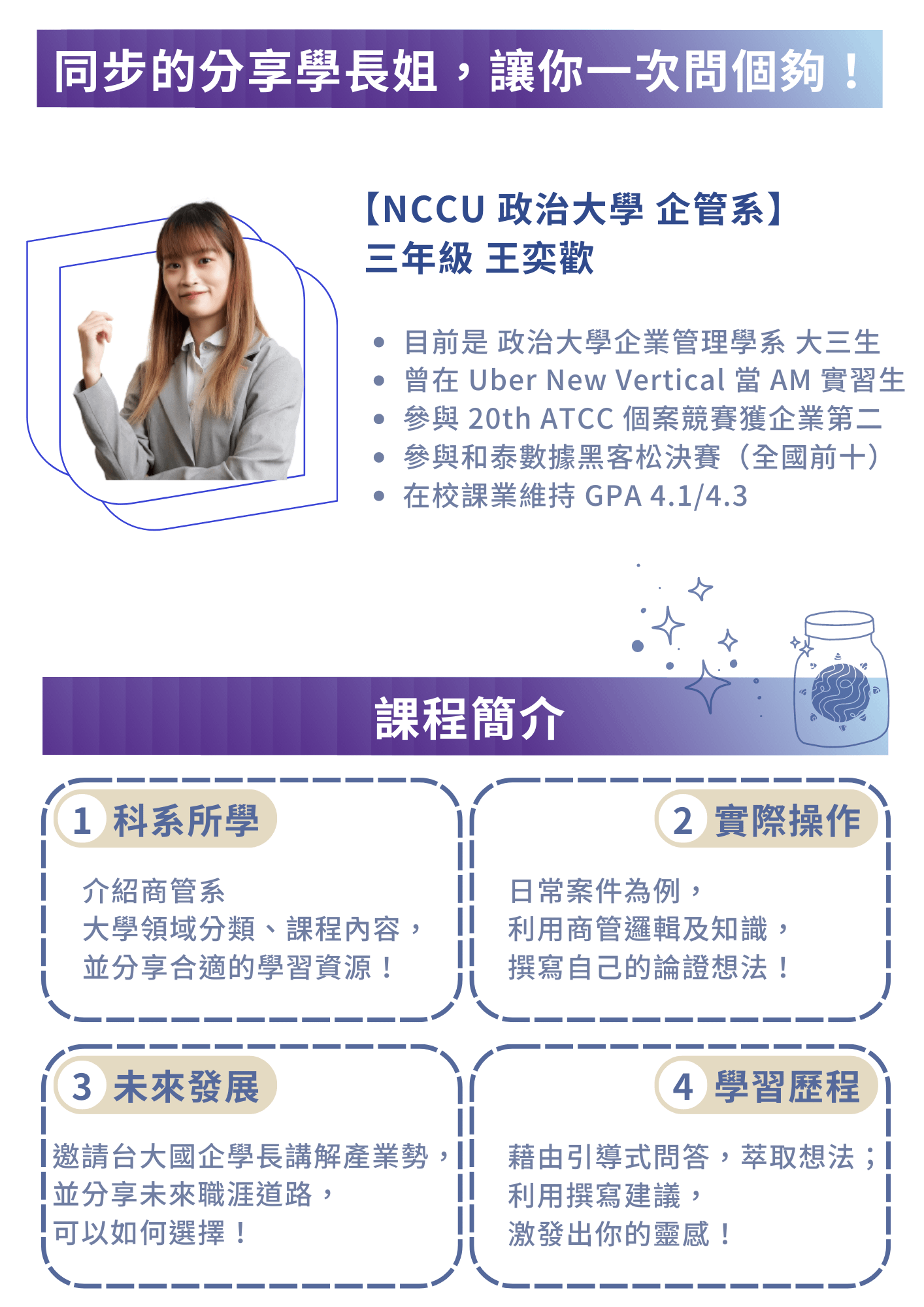 曾是陽明交通大學【數位工具商用化實戰】課程主理人,喜歡使用數位工具,解決問題。在教育現場,設計出線上營隊、學習歷程撰寫系統...等數位方案,提升同學效率,找到自己的心之所向。