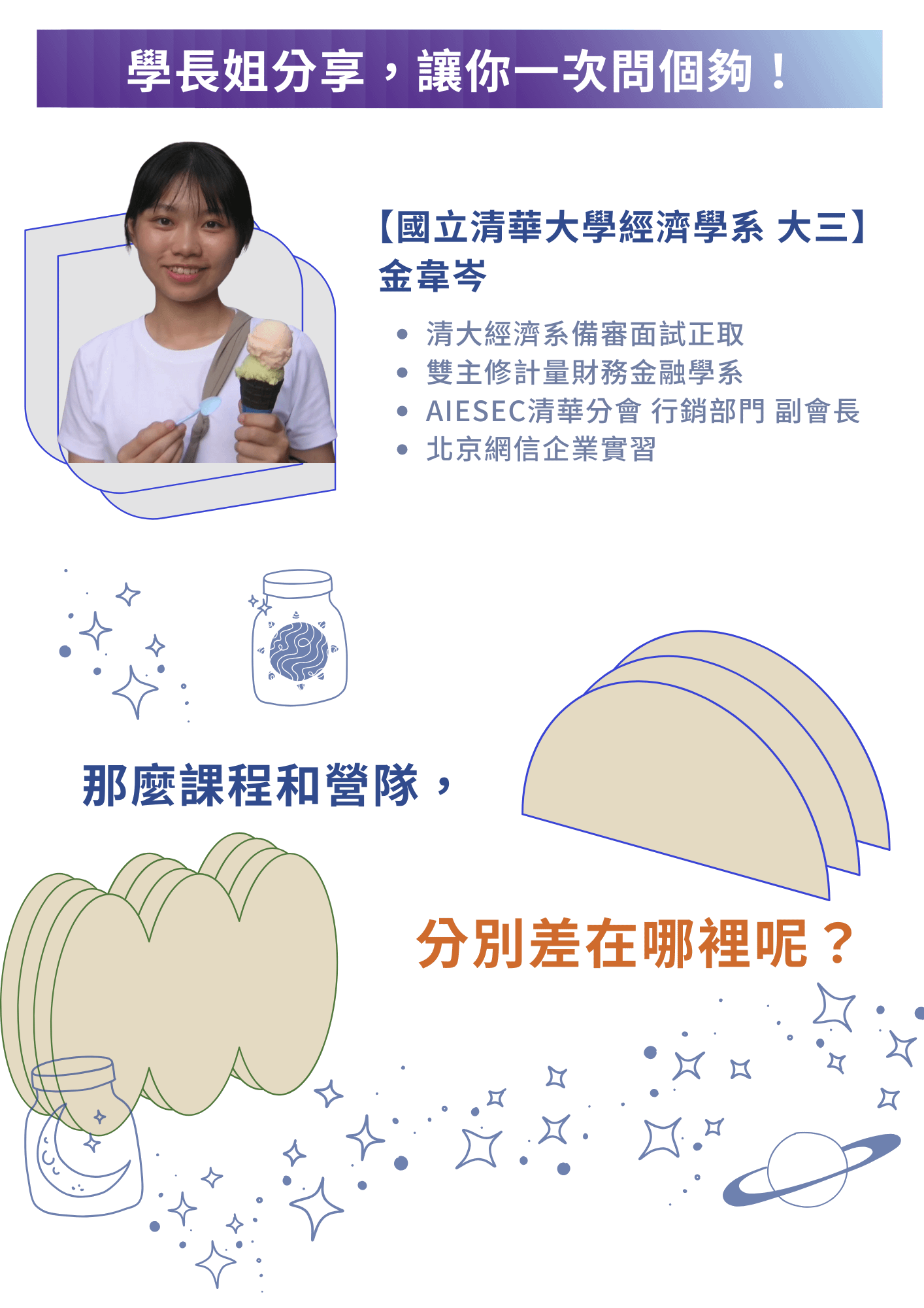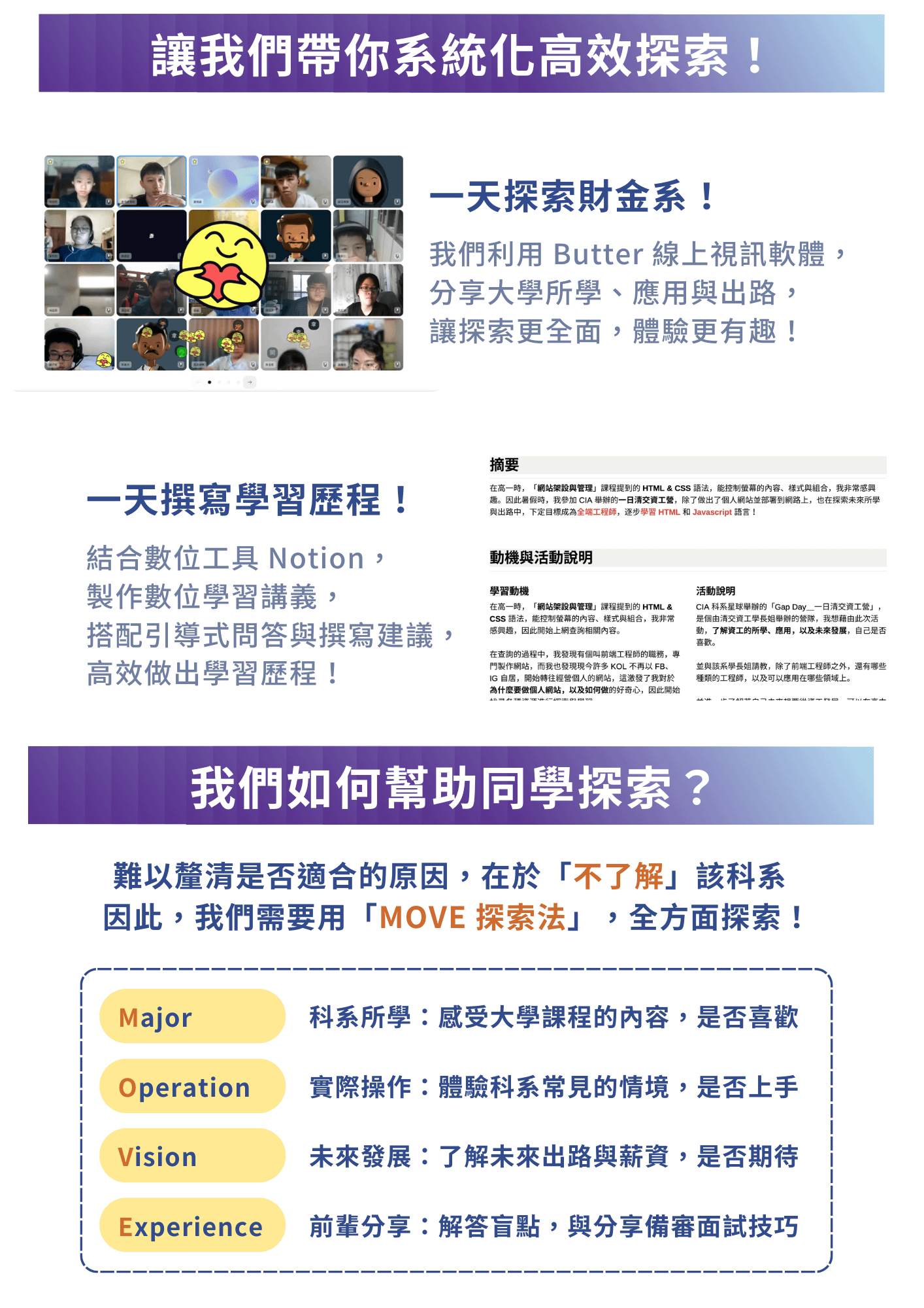 曾是陽明交通大學【數位工具商用化實戰】課程主理人,喜歡使用數位工具,解決問題。在教育現場,設計出線上營隊、學習歷程撰寫系統...等數位方案,提升同學效率,找到自己的心之所向。
