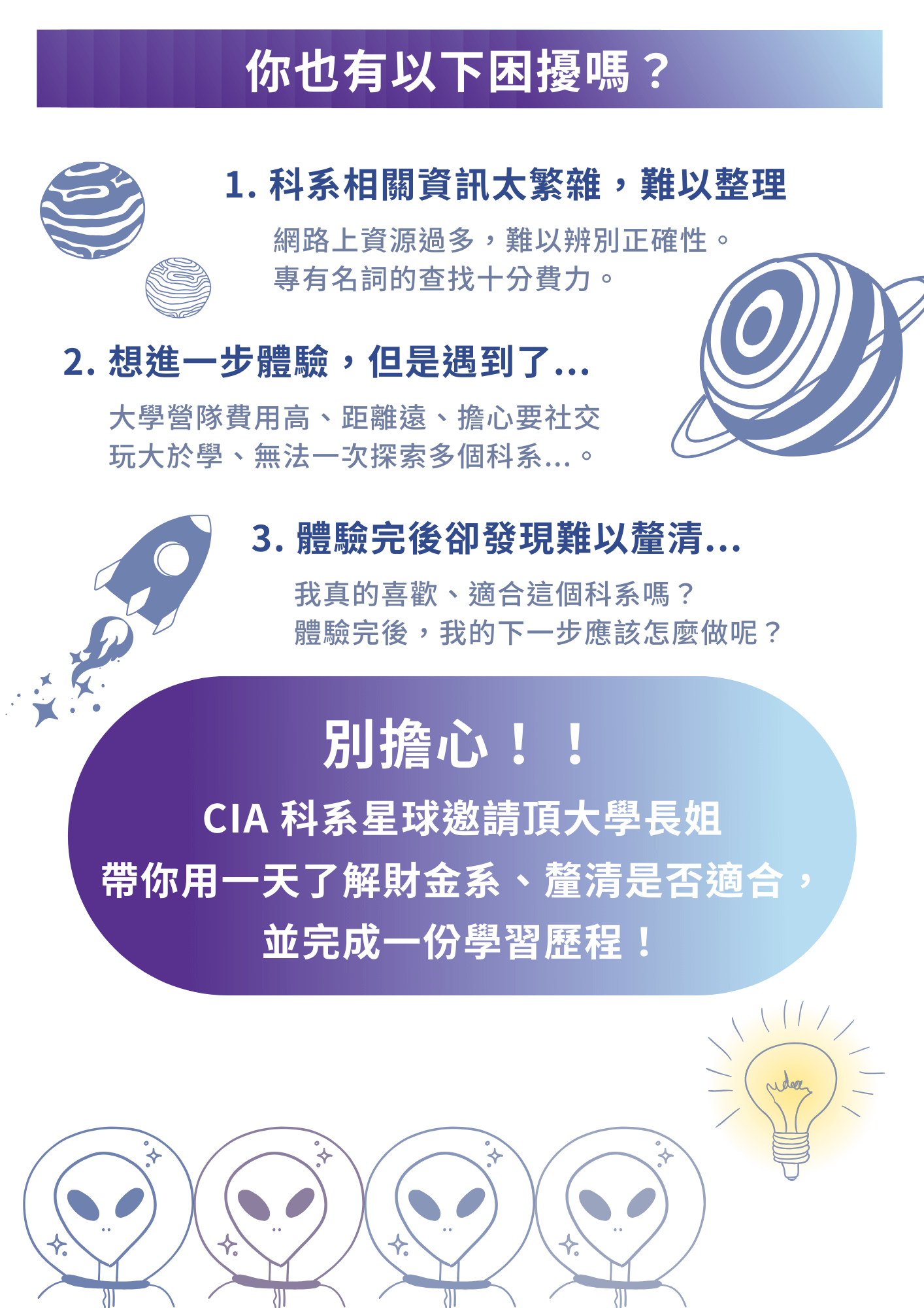 本營隊為獨立運營,並非由任何大學或其科系單位主辦、合作或認可。我們的宗旨是協助高中生探索不同學科的興趣與潛力,以便更好地規劃其學術和職業道路。本營隊的參與與否,與大學錄取無任何直接或間接關聯,亦不影響任何大學的入學決策。