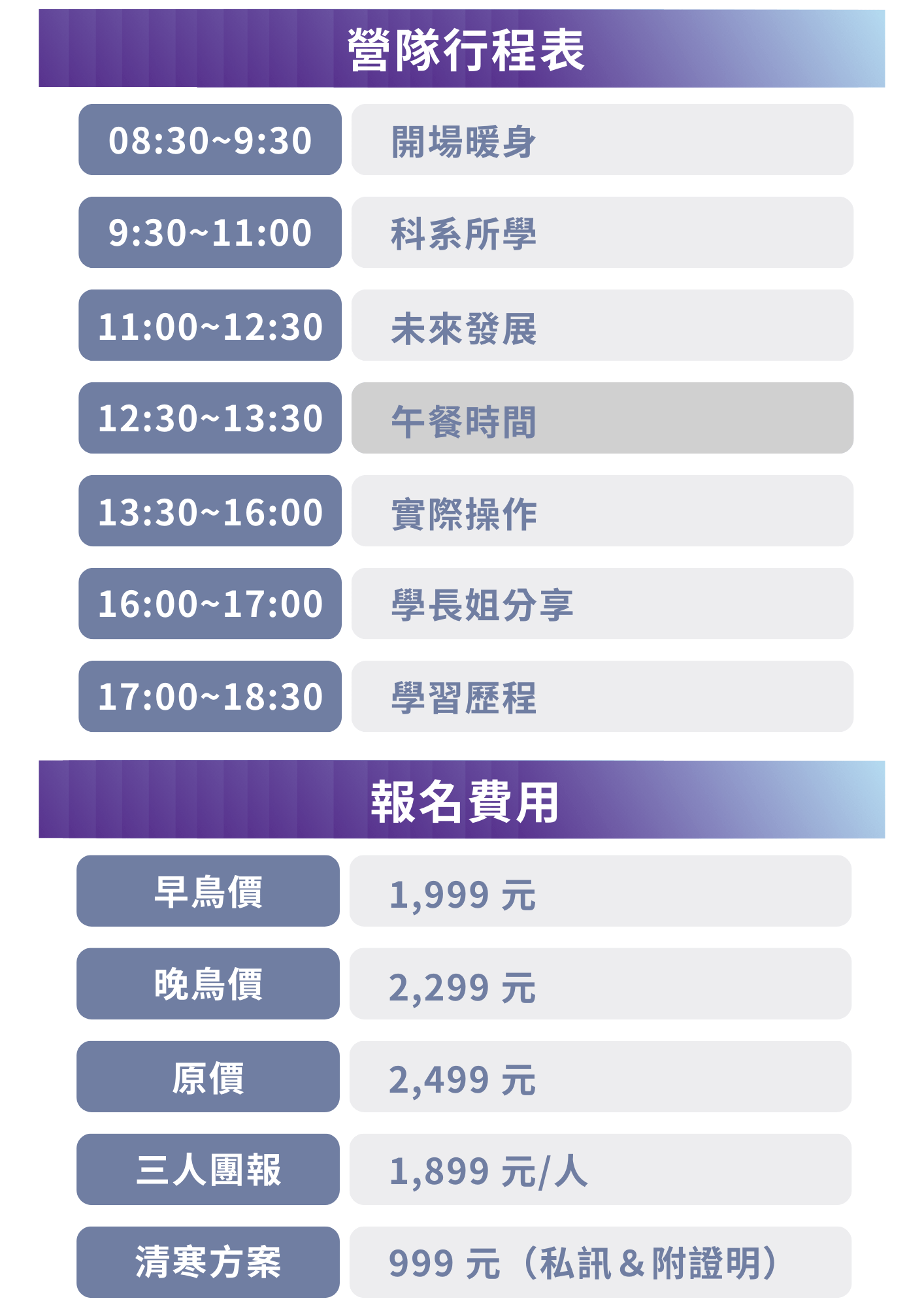 本營隊為獨立運營,並非由任何大學或其科系單位主辦、合作或認可。我們的宗旨是協助高中生探索不同學科的興趣與潛力,以便更好地規劃其學術和職業道路。本營隊的參與與否,與大學錄取無任何直接或間接關聯,亦不影響任何大學的入學決策。