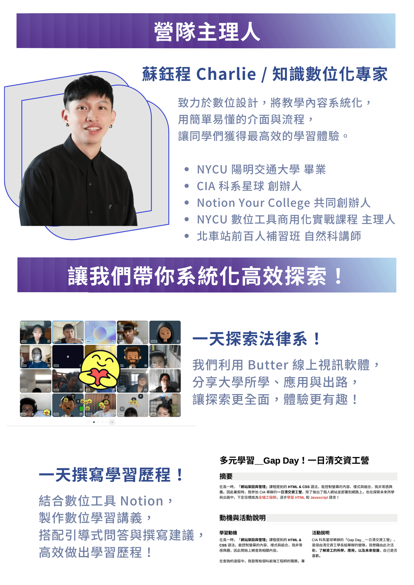 曾是陽明交通大學【數位工具商用化實戰】課程主理人,喜歡使用數位工具,解決問題。在教育現場,設計出線上營隊、學習歷程撰寫系統...等數位方案,提升同學效率,找到自己的心之所向。