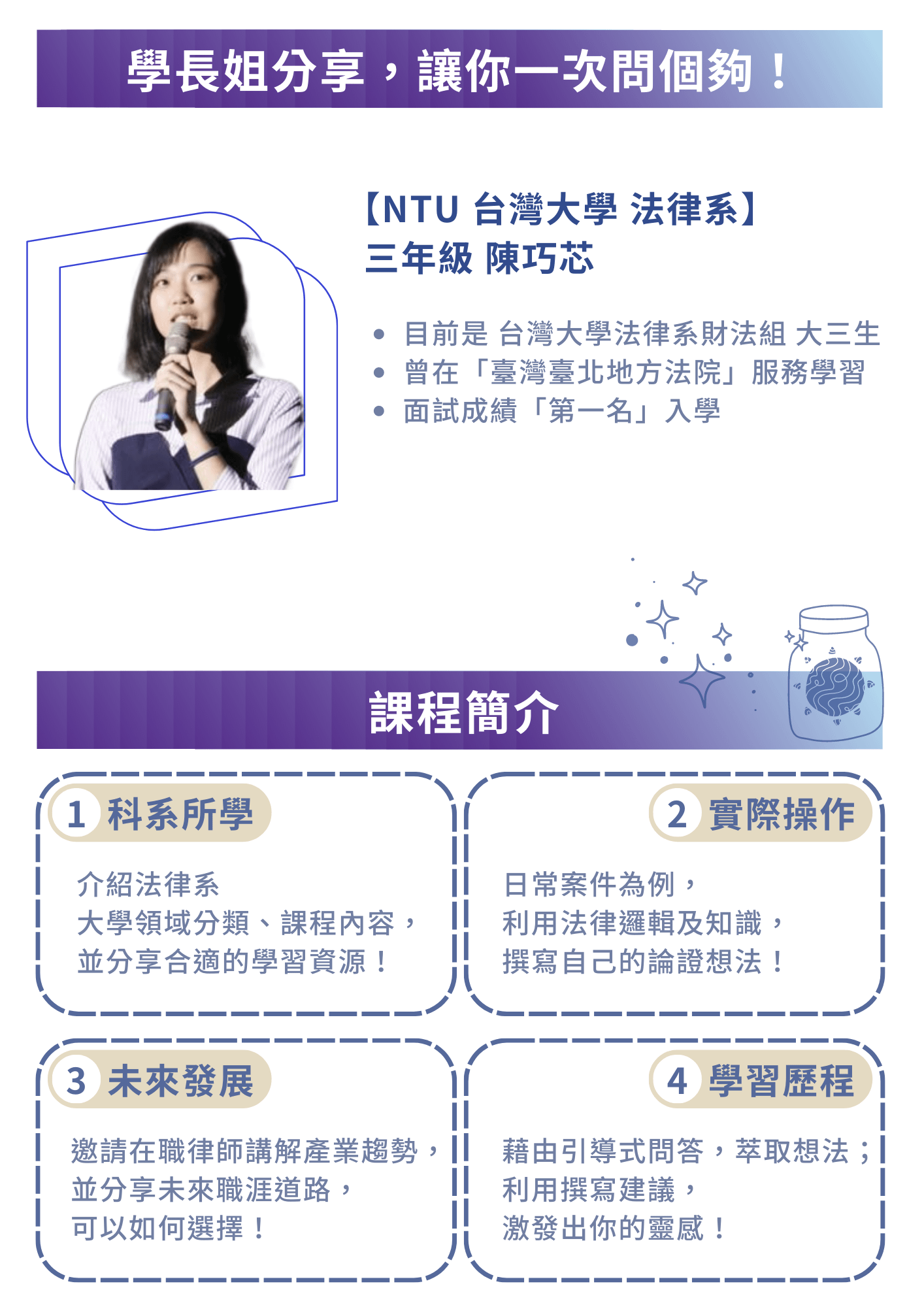 曾是北區自然補教講師,熟稔高中 108 課綱,擅長協助同學探索科系,釐清自己是否適合,以及撰寫學習歷程。