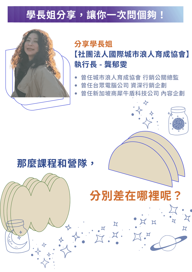 曾是陽明交通大學【數位工具商用化實戰】課程主理人,喜歡使用數位工具,解決問題。在教育現場,設計出線上營隊、學習歷程撰寫系統...等數位方案,提升同學效率,找到自己的心之所向。