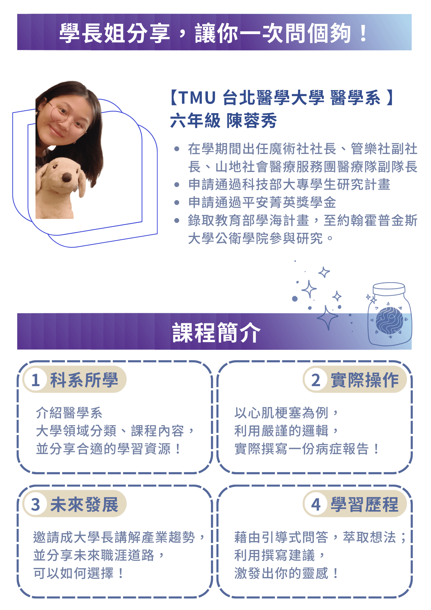曾是陽明交通大學【數位工具商用化實戰】課程主理人,喜歡使用數位工具,解決問題。在教育現場,設計出線上營隊、學習歷程撰寫系統...等數位方案,提升同學效率,找到自己的心之所向。