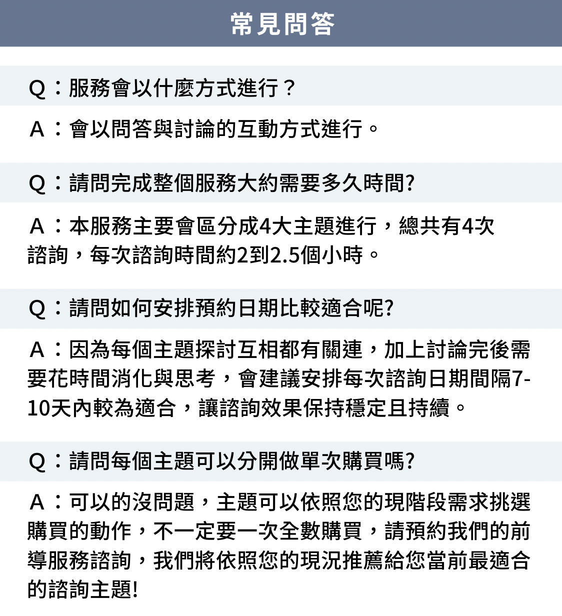 | 服務時長 | 分為4次做諮詢,每次諮詢時間約2到2.5個小時 |