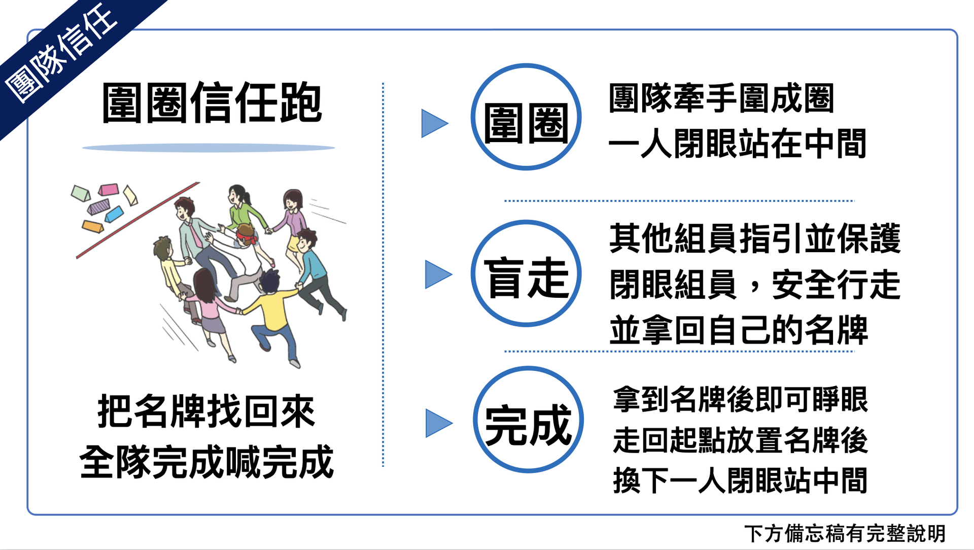 - 「信任跑步」團隊圍成圈,中間人閉眼一起跑步前進