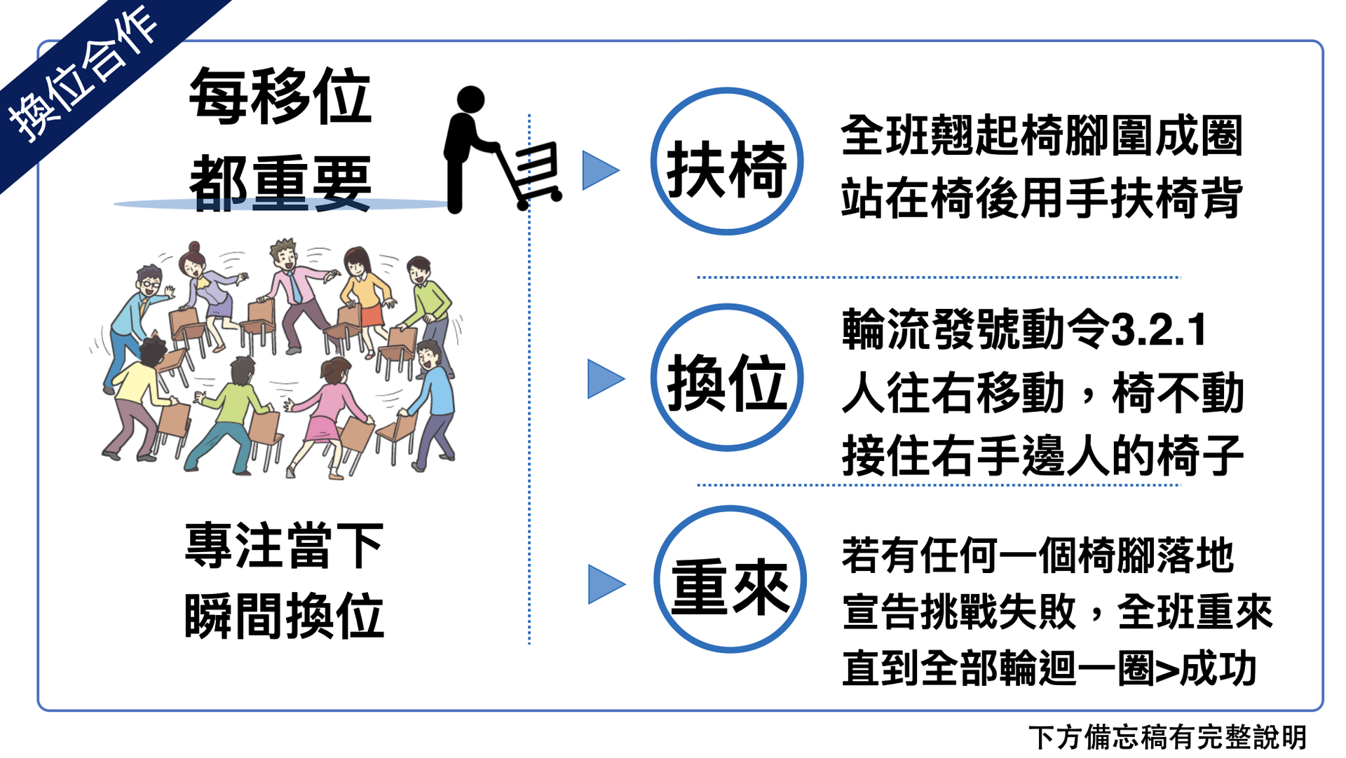 - 「換位接椅」每移位都重要,接住他人的椅子並放手